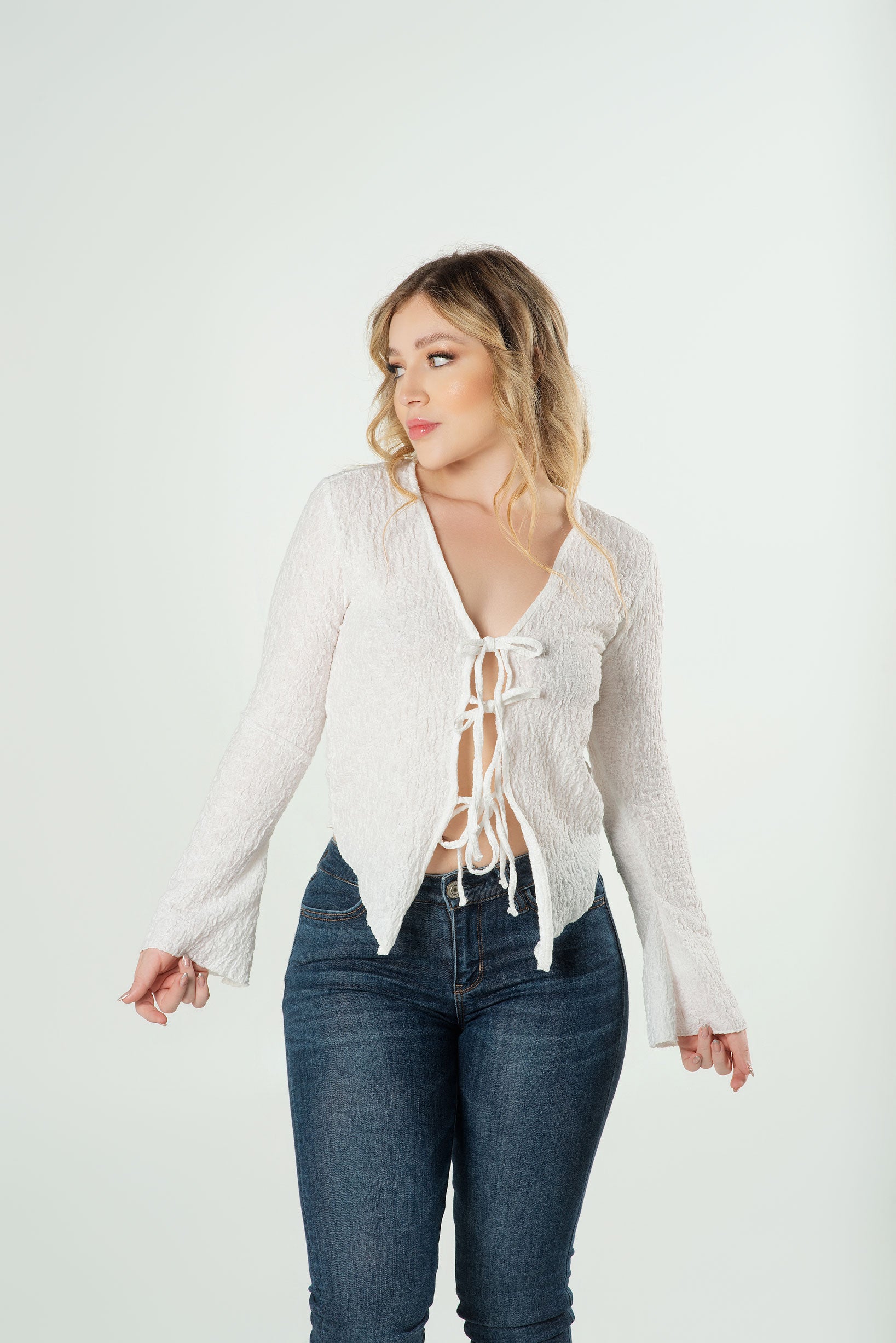 Dale un toque de dulzura y sofisticación a tu outfit con nuestra Blusa Moños Tela Craquelada. Esta prenda captura la esencia de la feminidad moderna combinando dos de las tendencias más fuertes de la temporada: el tejido con efecto craquelado (texturizado) y los detalles de moños decorativos. Es la blusa perfecta para la mujer que busca destacar con un estilo romántico, cómodo y lleno de personalidad en tonos neutros elegantes.
