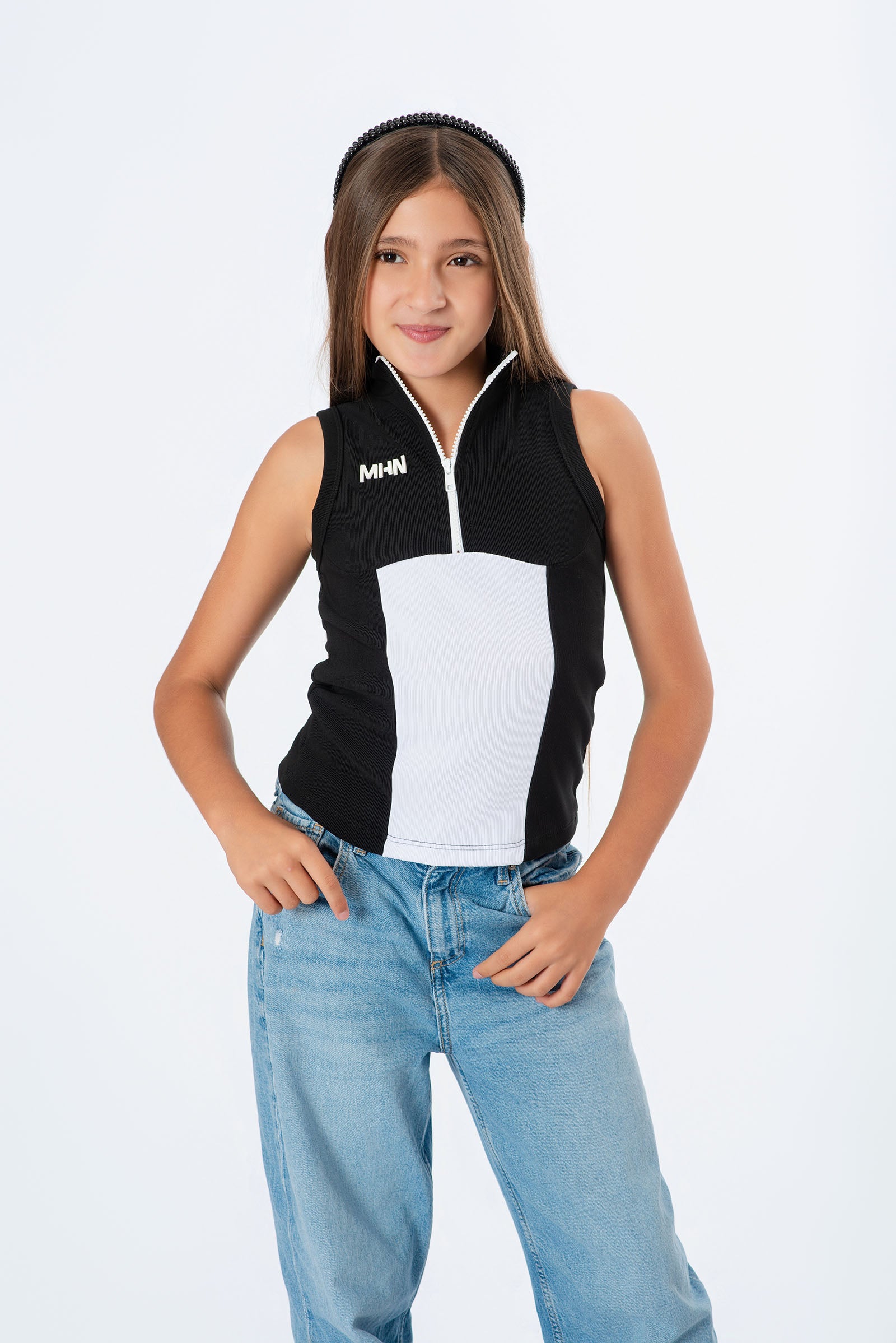 ¿Buscas una blusa teens con cierre que sea cómoda, moderna y combinable? Este top sin mangas de rib bicolor con medio cierre frontal ofrece el equilibrio perfecto entre estilo deportivo y versatilidad diaria: realza tu figura, se ajusta suave al cuerpo y permite regular la ventilación para que te sientas fresca todo el día.