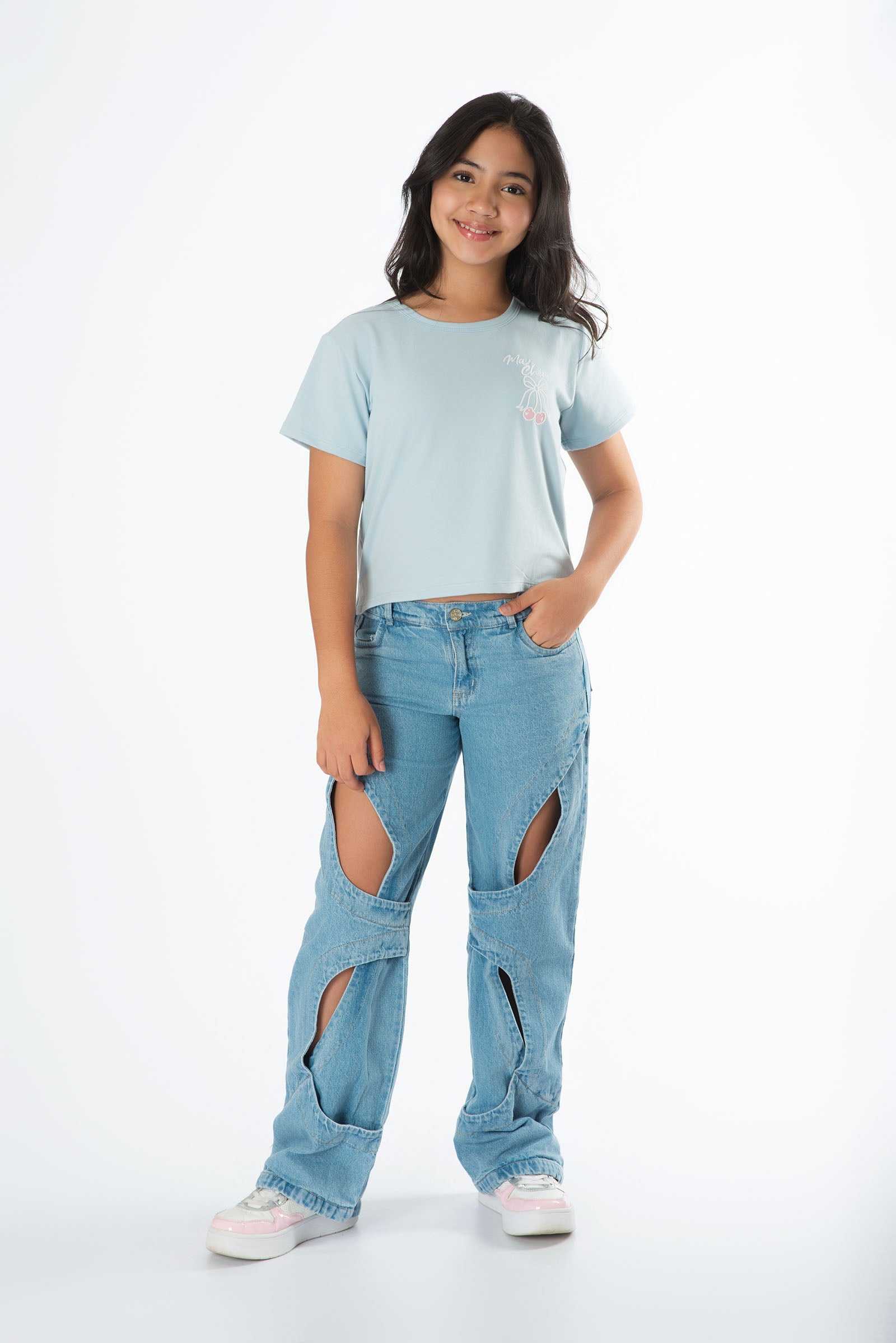 ¿Buscas un look fresco, tierno y con actitud para tu niña? Este conjunto camiseta estampado moño con jeans de denim rígido combina suavidad y comodidad arriba con un jean urbano de aberturas que roba miradas. Ideal para días activos, fotos y salidas casuales.
