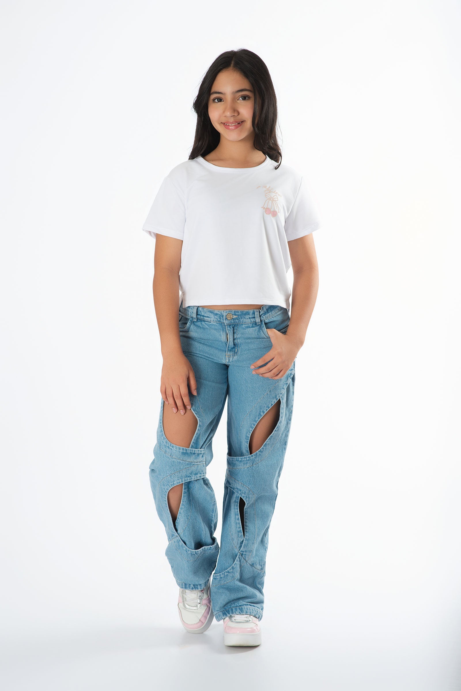 ¿Buscas un look fresco, tierno y con actitud para tu niña? Este conjunto camiseta estampado moño con jeans de denim rígido combina suavidad y comodidad arriba con un jean urbano de aberturas que roba miradas. Ideal para días activos, fotos y salidas casuales.