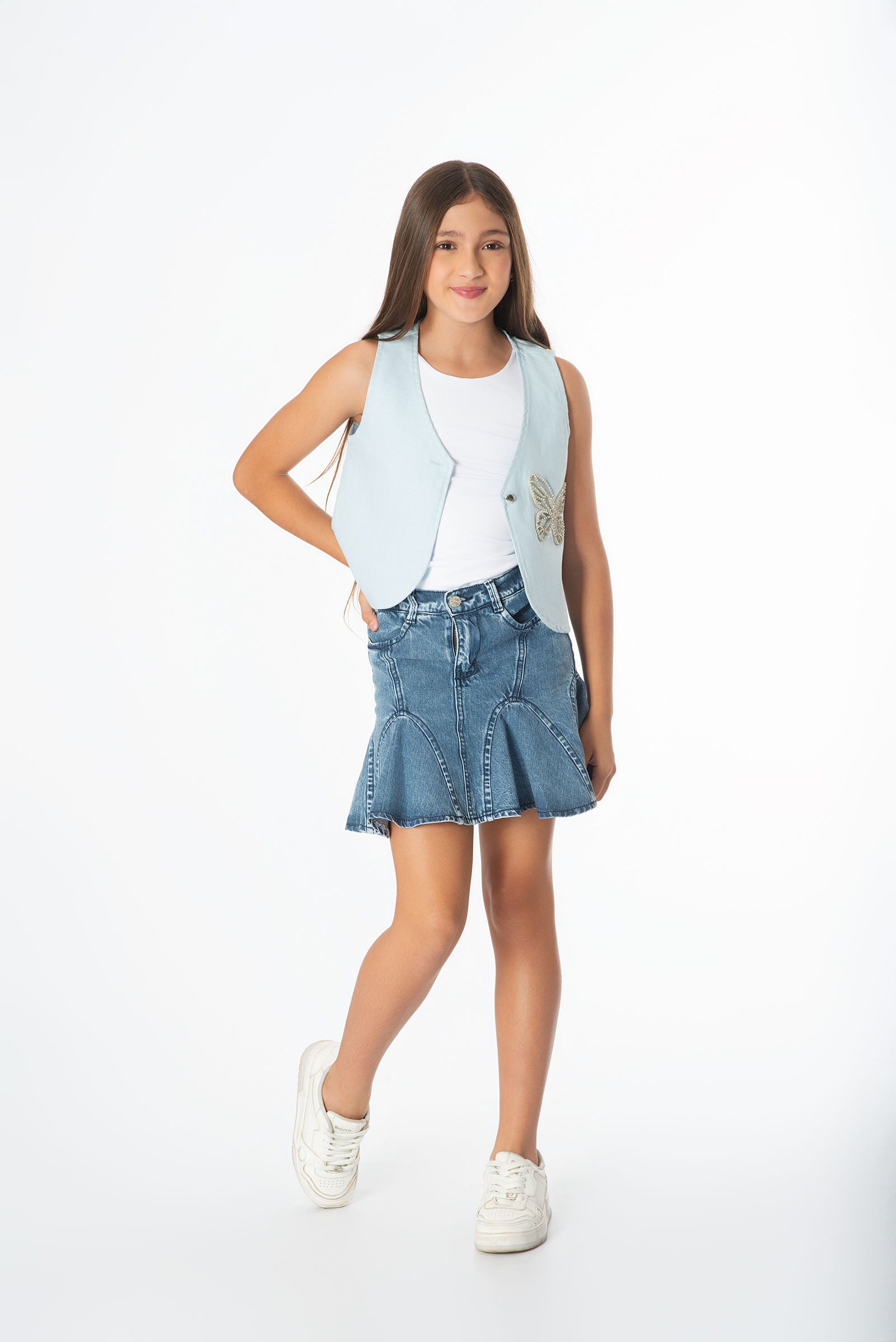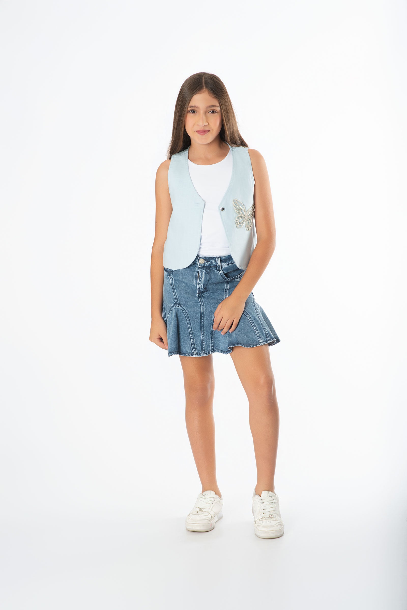 El Conjunto Falda Denim Mariposa es el outfit de dos piezas que inyecta elegancia y diversión en el armario juvenil. Combina una minifalda de vuelo en denim Chambray con un chaleco sisa de Lino adornado con un llamativo aplique de mariposa con brillos. Este look es fácil de llevar y perfecto para las jóvenes que aman los detalles coquetos y el estilo chic desenfadado.