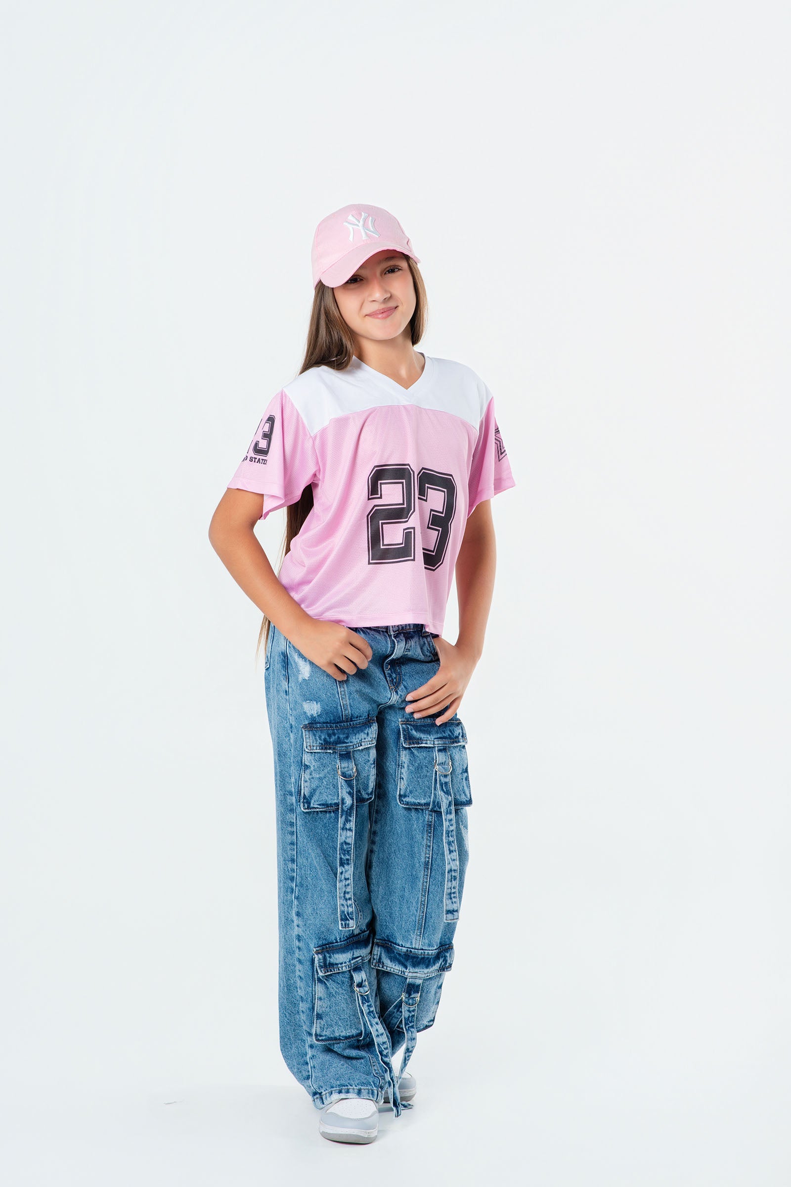 El conjunto jeans cargo con camiseta #23 está pensado para esas chicas activas que quieren verse cool sin renunciar a la comodidad. Combina una camiseta deportiva ligera con un jean cargo de mezclilla rígida y muchos bolsillos: perfecto para jugar, salir y crear looks urbanos que duran.