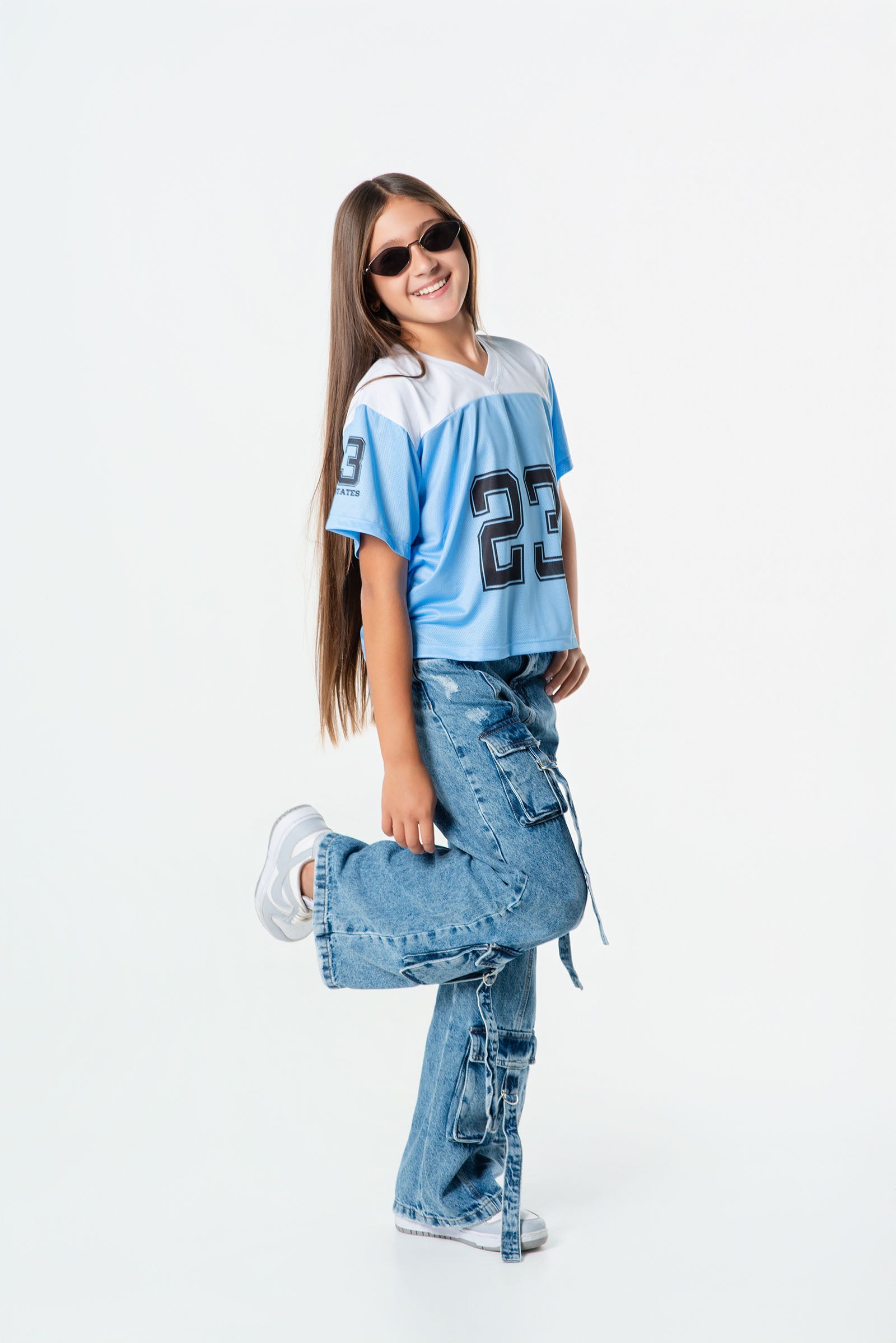 El conjunto jeans cargo con camiseta #23 está pensado para esas chicas activas que quieren verse cool sin renunciar a la comodidad. Combina una camiseta deportiva ligera con un jean cargo de mezclilla rígida y muchos bolsillos: perfecto para jugar, salir y crear looks urbanos que duran.