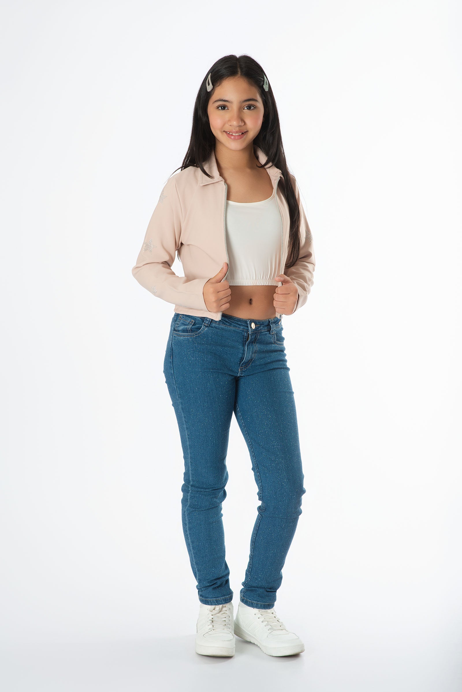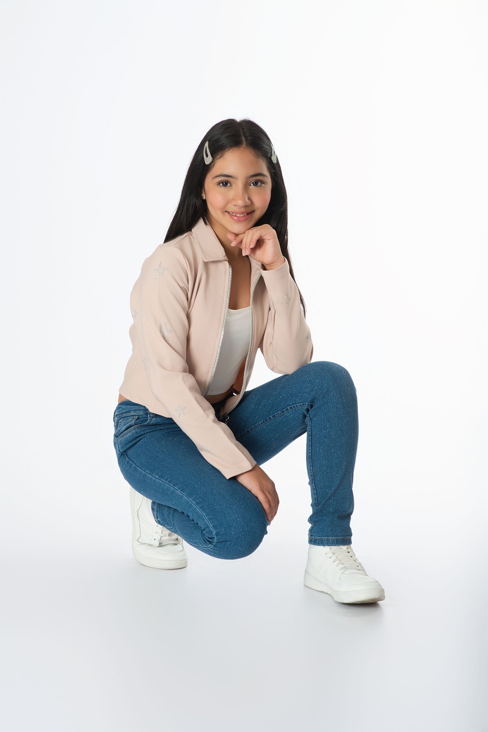 Luce un estilo brillante y cómodo con nuestro conjunto jeans mirellado y blazer con estrellas. Diseñado para chicas que aman destacar sin perder movilidad, este outfit de 3 piezas (blazer corto, crop top y jeans) combina brillo sutil, telas suaves y un calce favorecedor. Perfecto para crear looks que roban miradas en fotos, salidas y celebraciones.