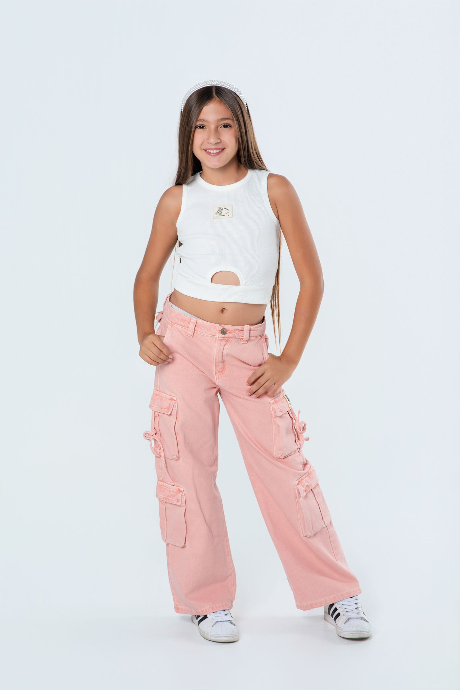 ¿Buscas un look urbano, cómodo y con mucho estilo para ella? Este conjunto pantalón cargo niña Froster combina un top rib suave con un pantalón cargo en drill natural de alta resistencia. Es la mezcla perfecta para jugar, salir y brillar sin perder comodidad.