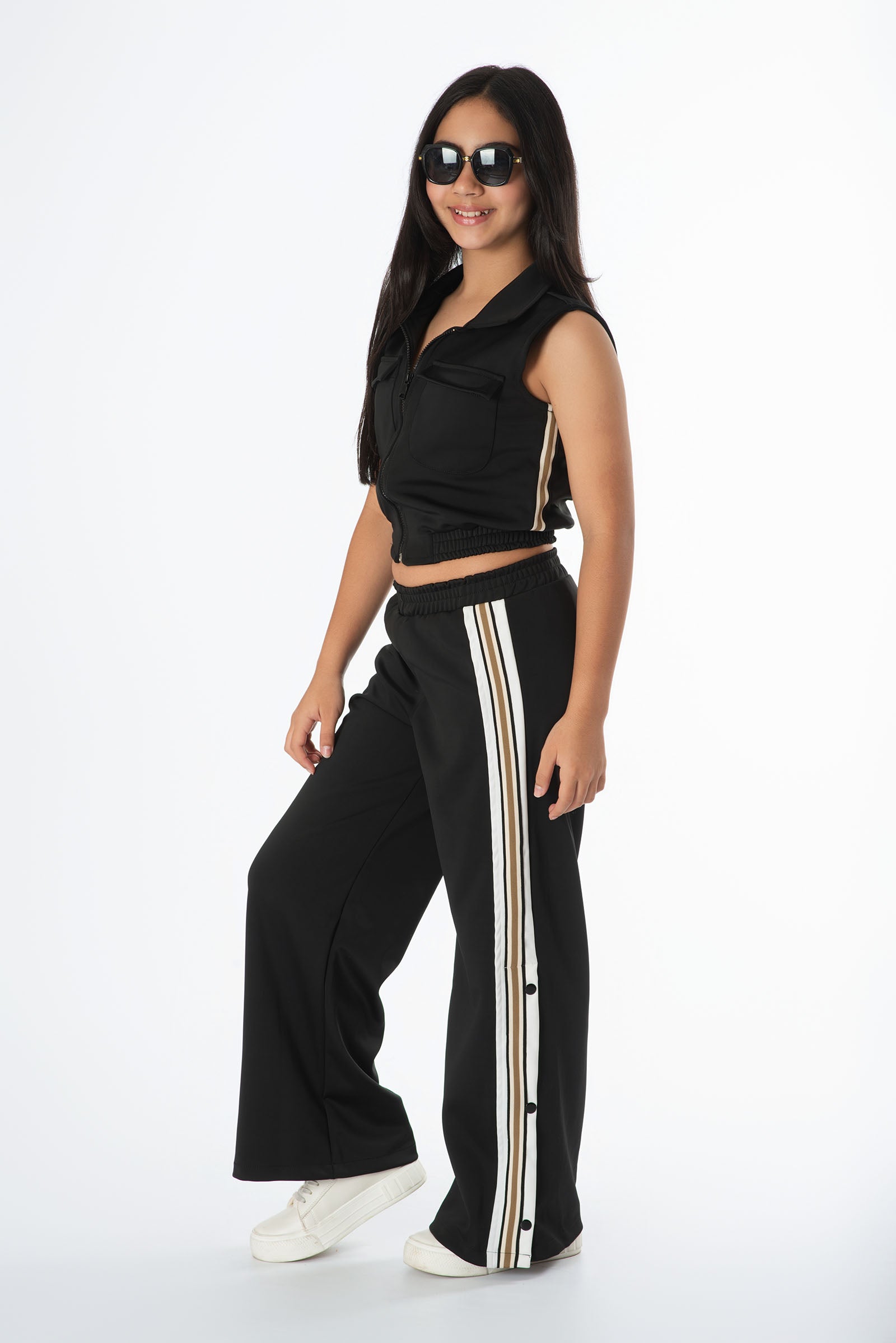 Fusiona la comodidad deportiva con un estilo streetwear de diseñador con nuestro Conjunto Pantalón Broches Juvenil. Confeccionado en el resistente y cómodo material PUNTIROMA, este set de dos piezas te ofrece un pantalón wide leg de broches laterales a presión que permite llevarlo abierto o cerrado, y un top crop con cremallera. Es el outfit ideal para la joven que busca un estilo audaz, versátil y lleno de actitud.