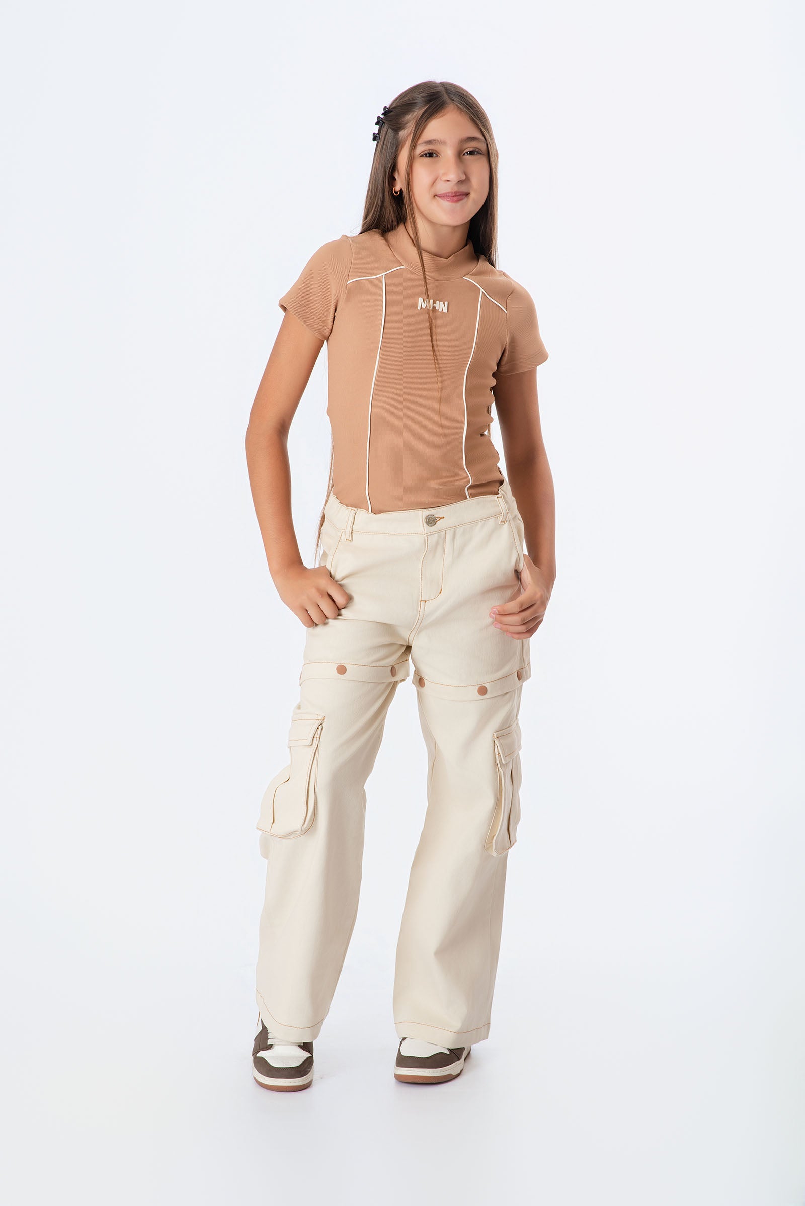 ¿Buscas versatilidad sin sacrificar estilo? Este conjunto pantalón convertible a short para niña combina un top cómodo en rib con un pantalón cargo de drill que se transforma en short con solo desabrochar unos botones. Dos looks en uno para que ella juegue, salga y brille todos los días.