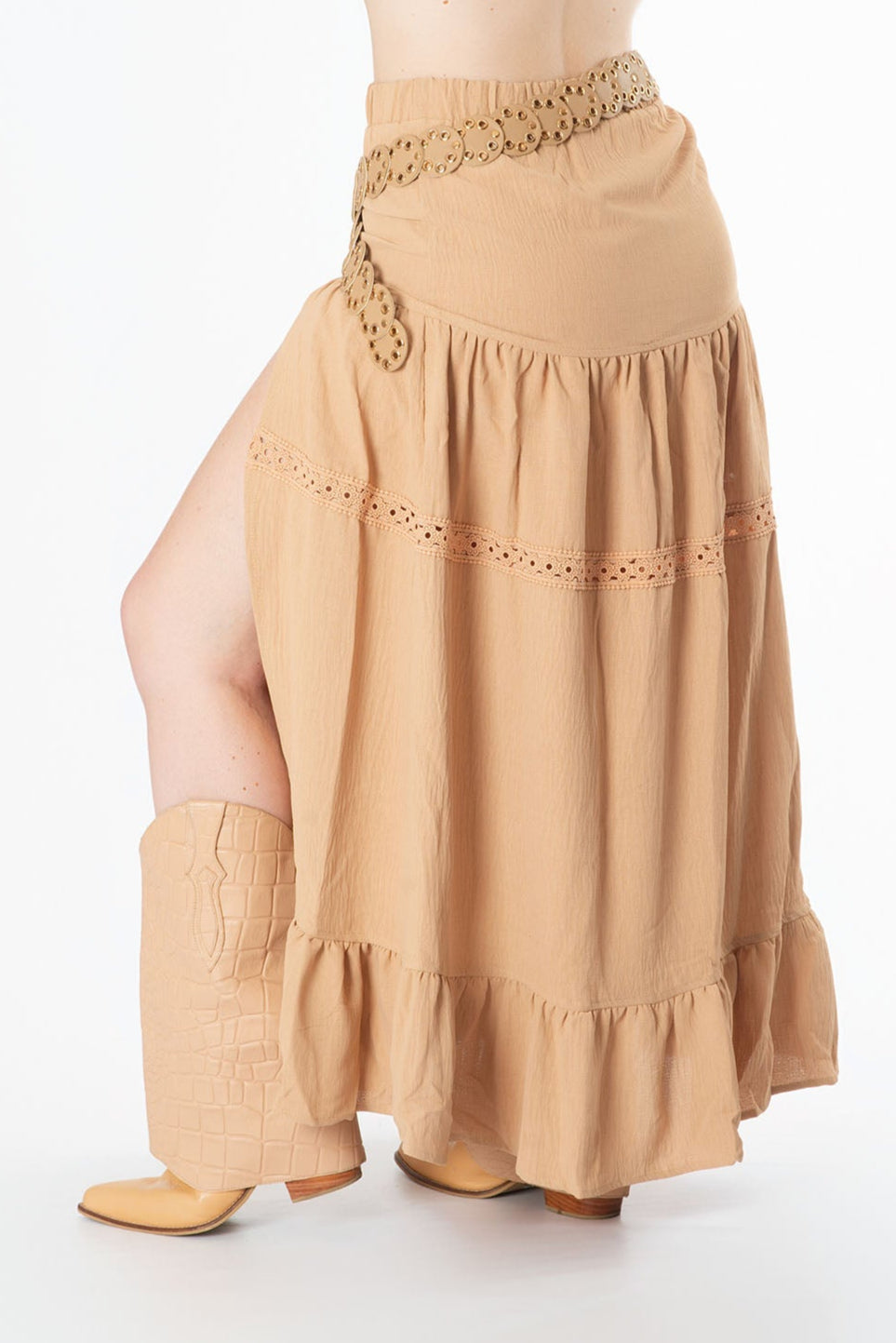 La falda larga en guipur es la pieza boho-chic que resuelve el “¿qué me pongo?” en eventos, fines de semana o la oficina creativa. Su caída ligera estiliza, la abertura lateral alarga tus piernas y el detalle de encaje añade un toque femenino sin esfuerzo.