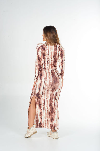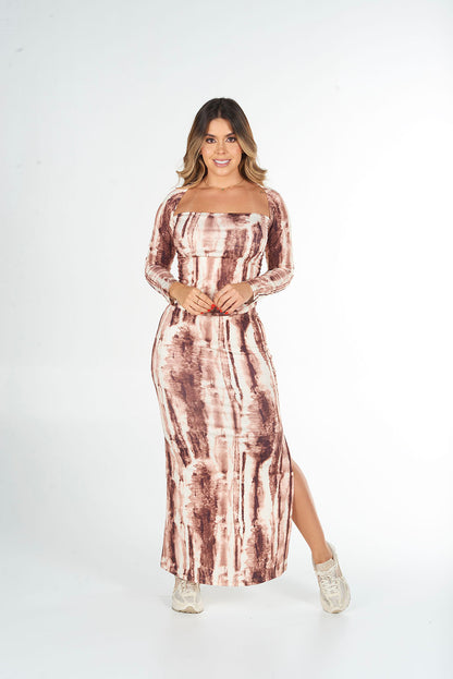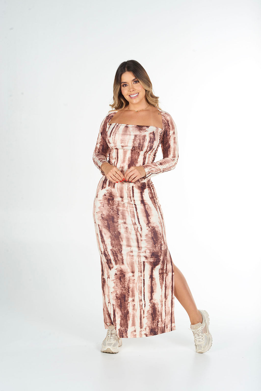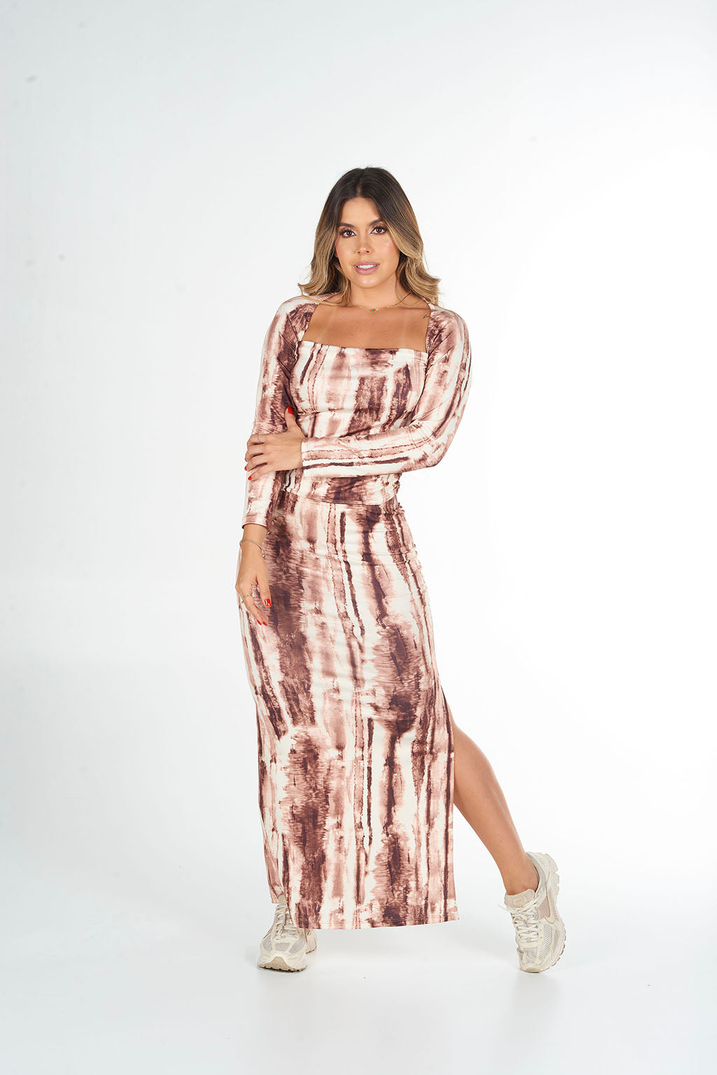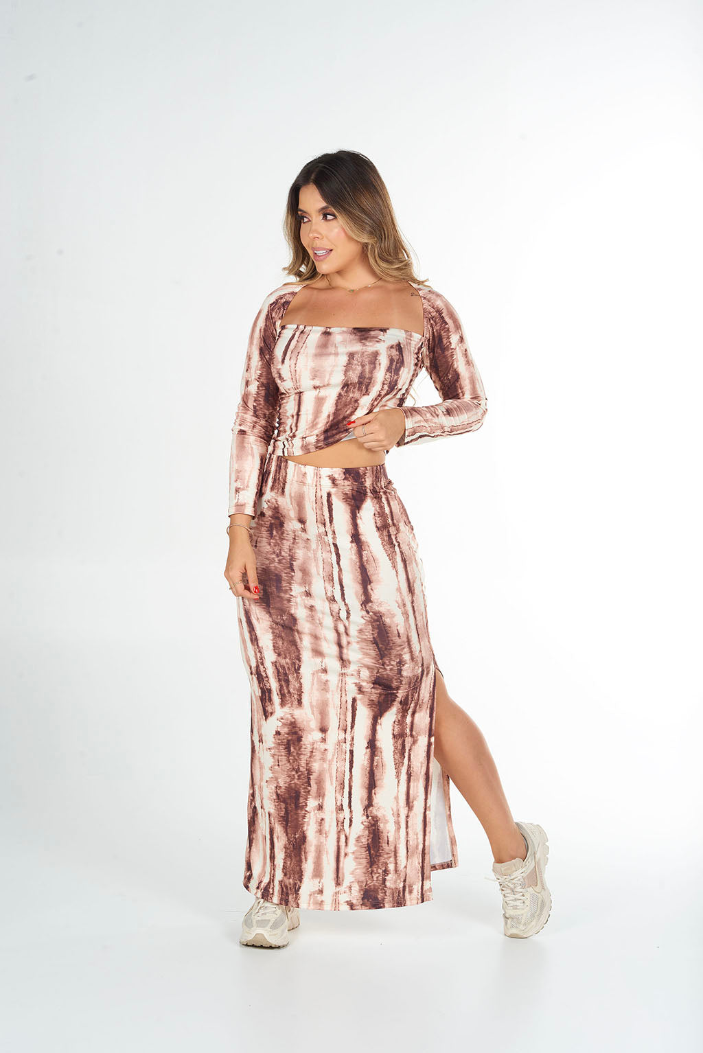 Set de dama compuesto por una blusa de manga larga con cuello barco y una falda larga con abertura en el costado de la pierna. Confeccionado en nylon microfibra, este conjunto ofrece una combinación perfecta de elegancia y comodidad. La falda tiene una altura media en la cintura, lo que resalta la figura, y la abertura lateral le añade un toque moderno y sofisticado. Ideal para un look casual o semi-formal.