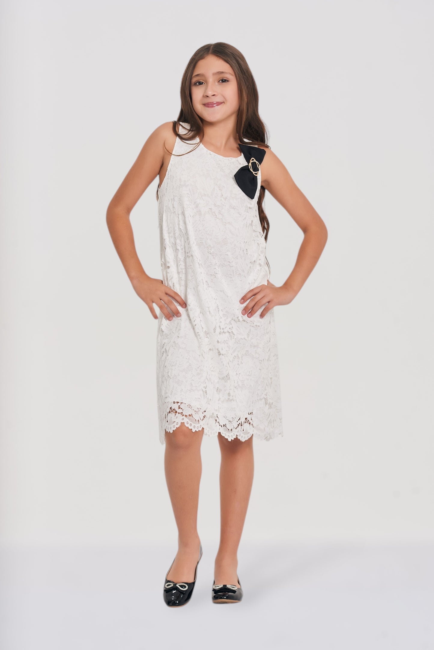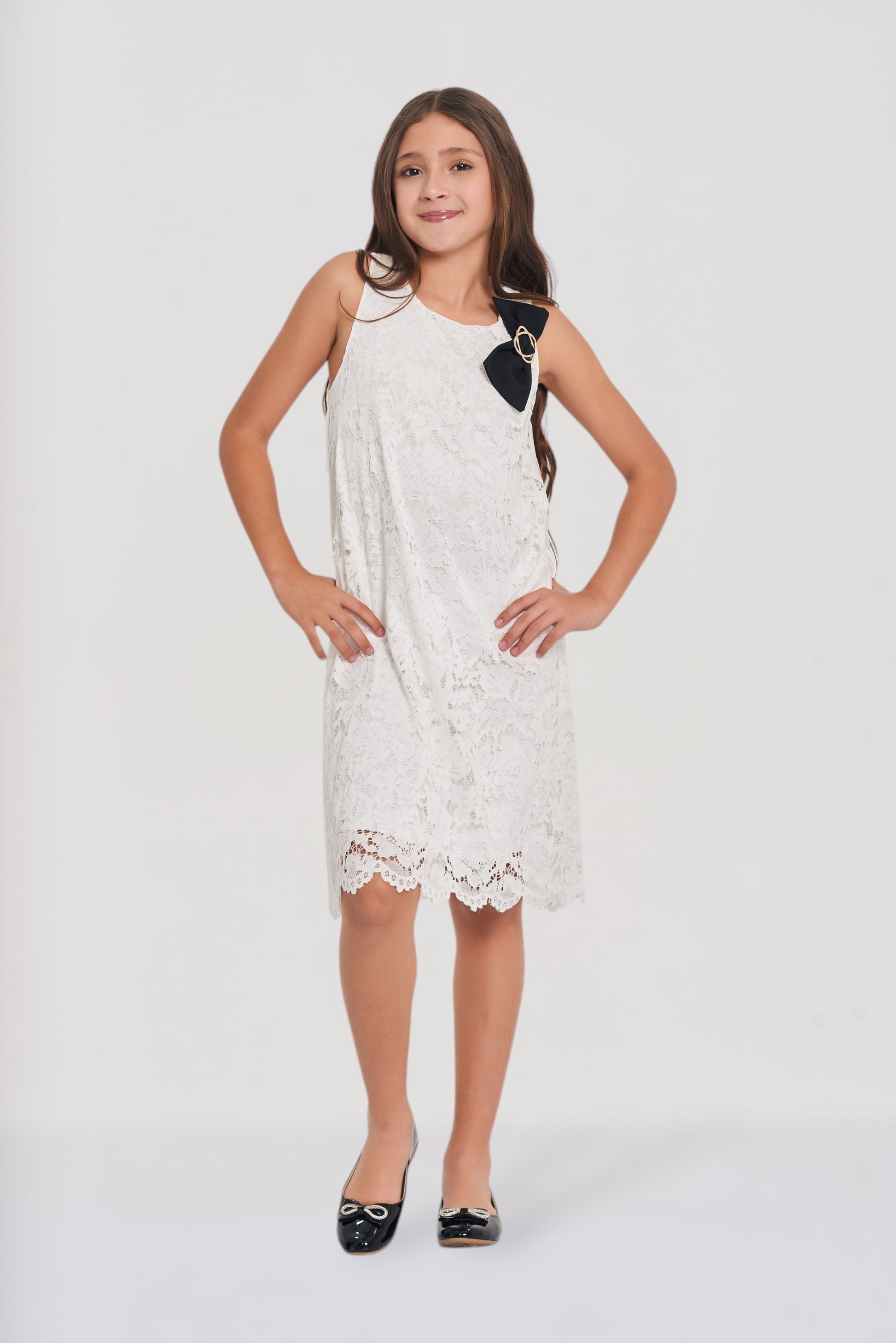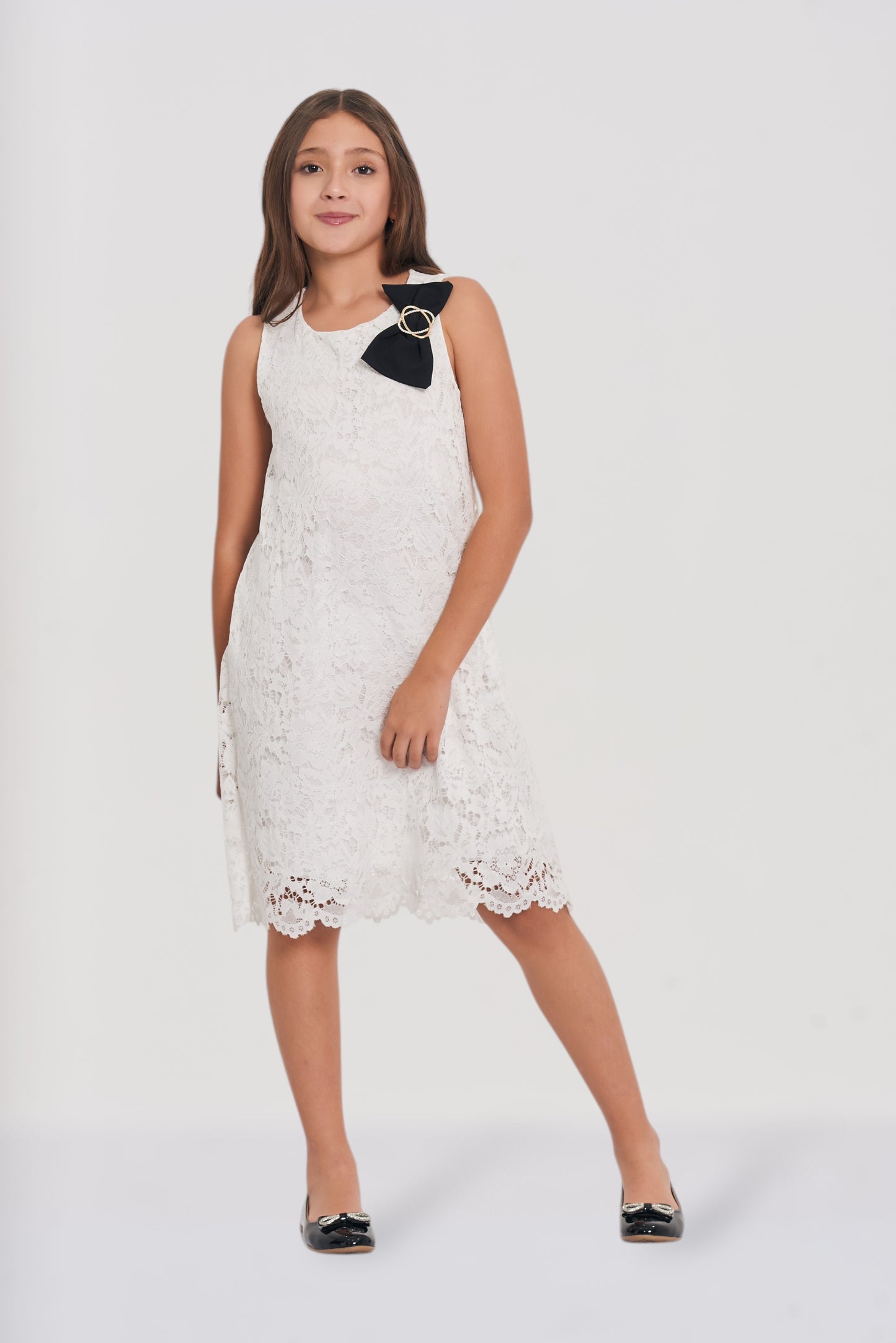 Vestido para niñas elaborado en delicada blonda, con un elegante moño en el hombro que añade un toque distintivo y encantador. Perfecto para eventos especiales, este diseño es cómodo y estilizado, ideal para hacerlas sentir como pequeñas princesas. Disponible en tallas 6 a 18.