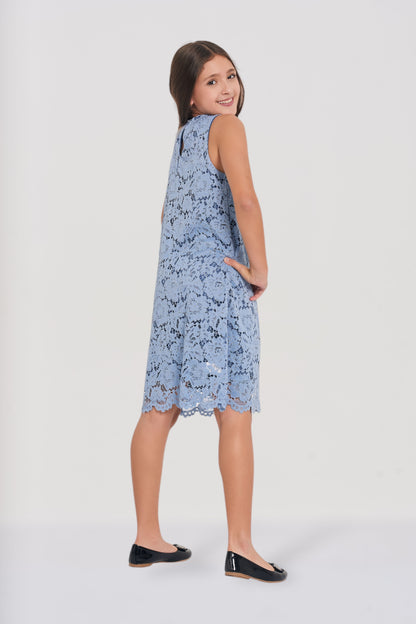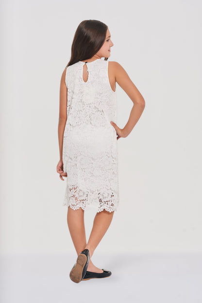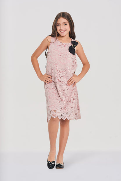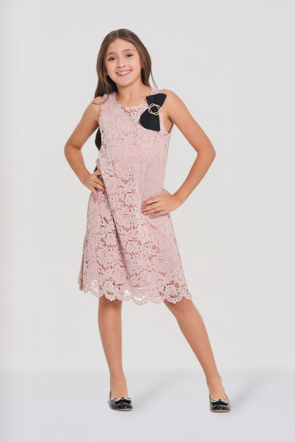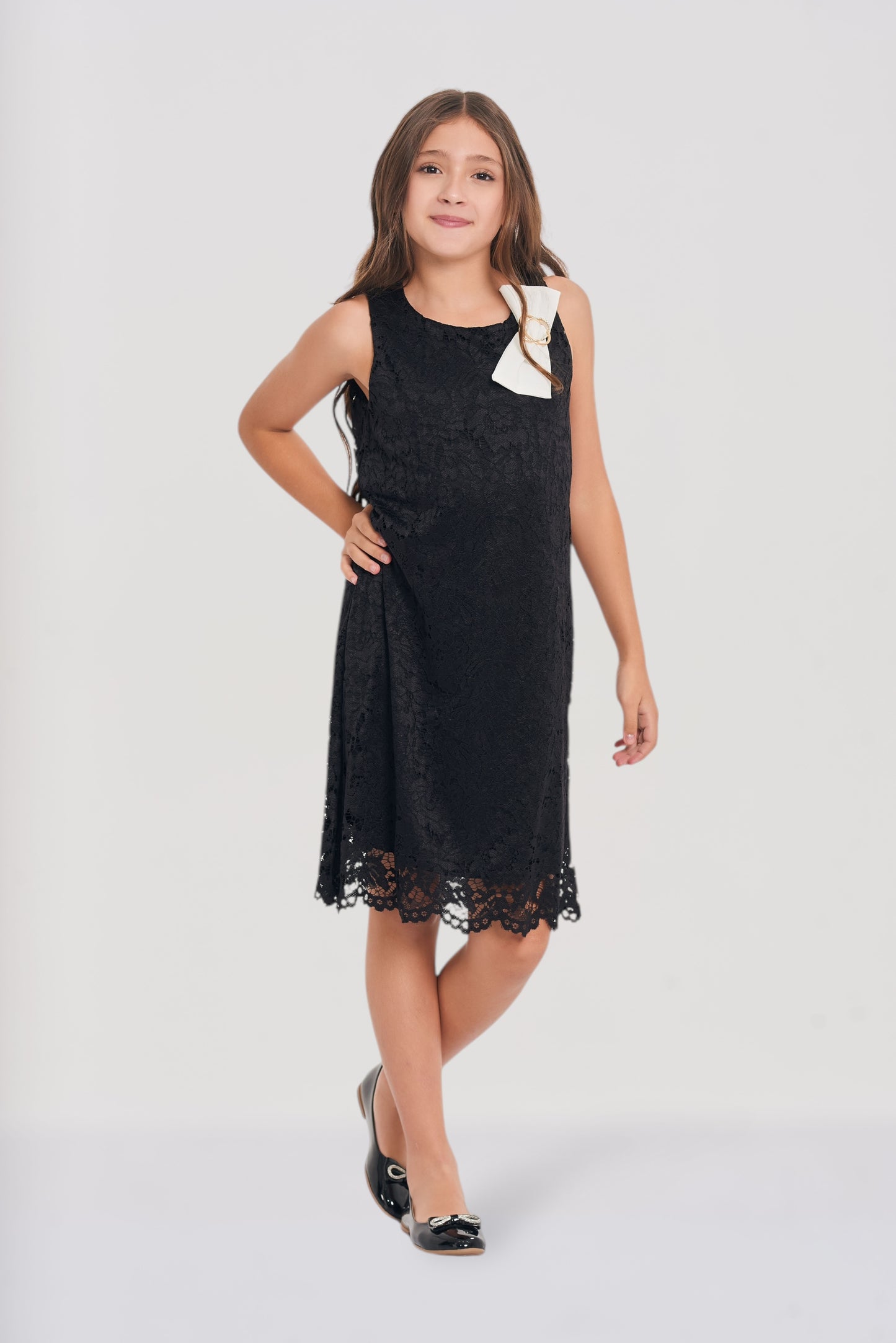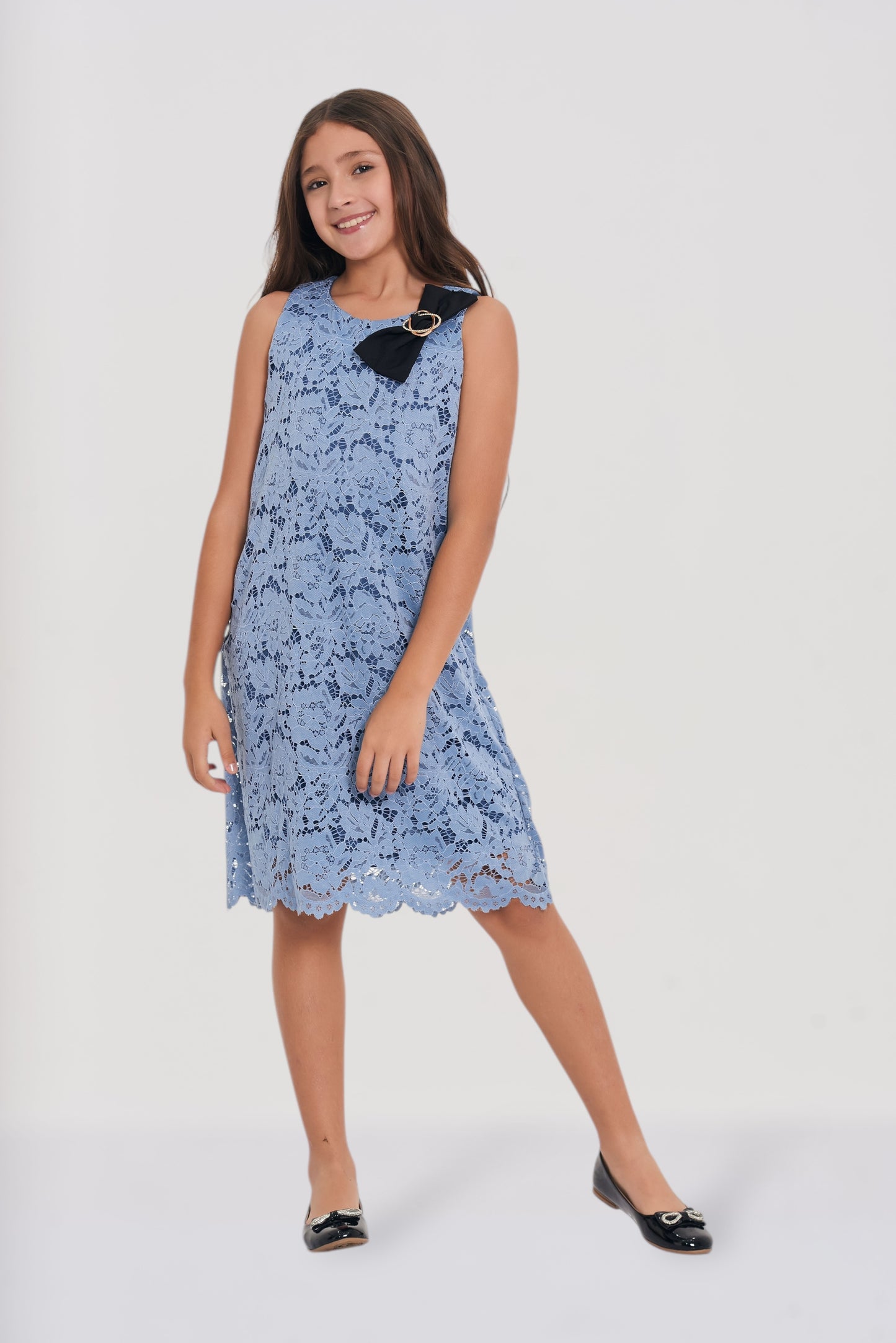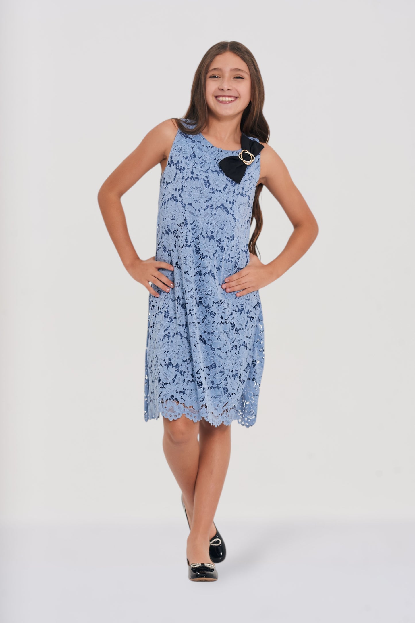 Vestido para niñas elaborado en delicada blonda, con un elegante moño en el hombro que añade un toque distintivo y encantador. Perfecto para eventos especiales, este diseño es cómodo y estilizado, ideal para hacerlas sentir como pequeñas princesas. Disponible en tallas 6 a 18.